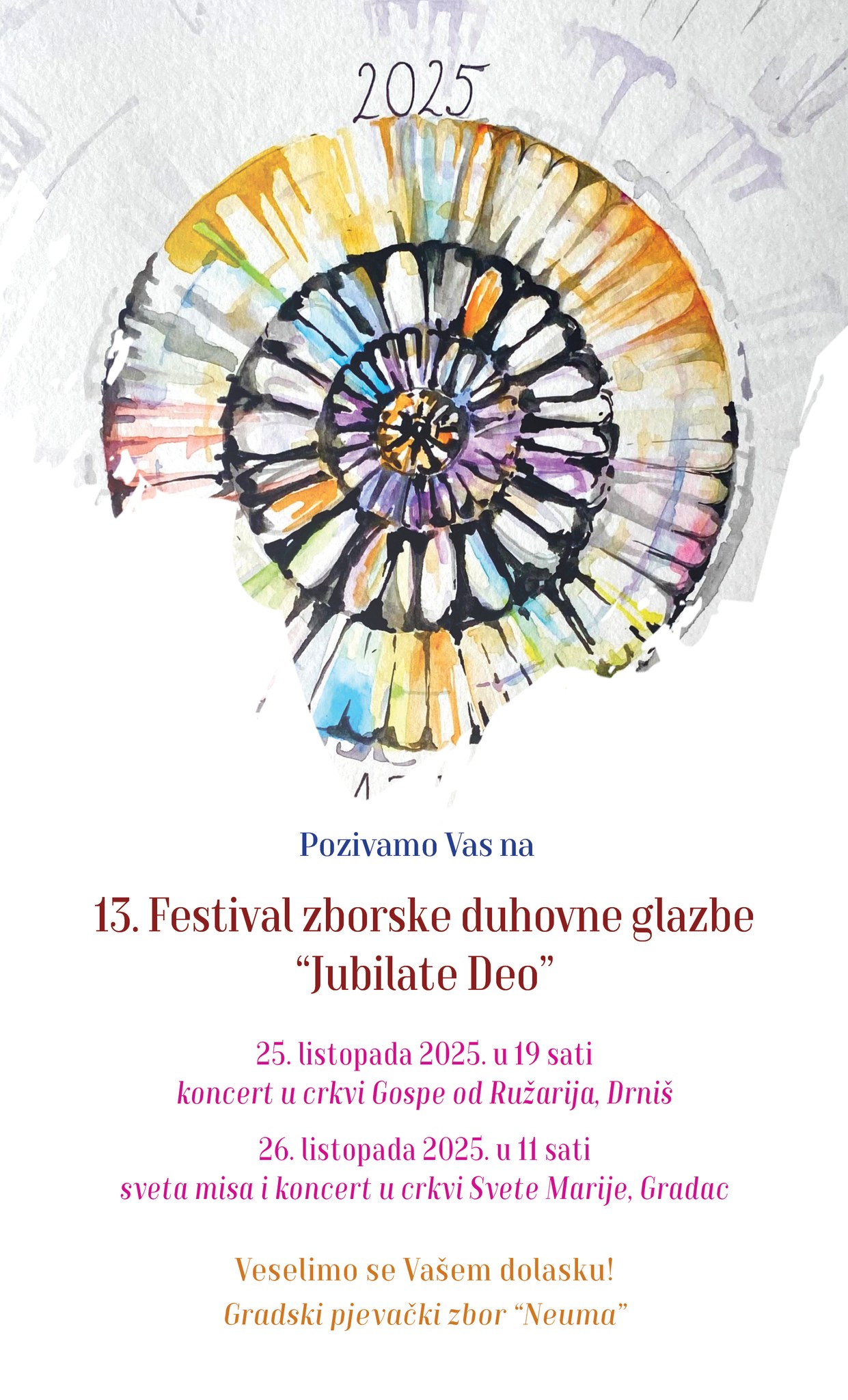 Sutra i prekosutra, 25. i 25. listopada 2025., u Drnišu se održava 13. izdanje Festivala zborske duhovne glazbe ‘Jubilate Deo’.
