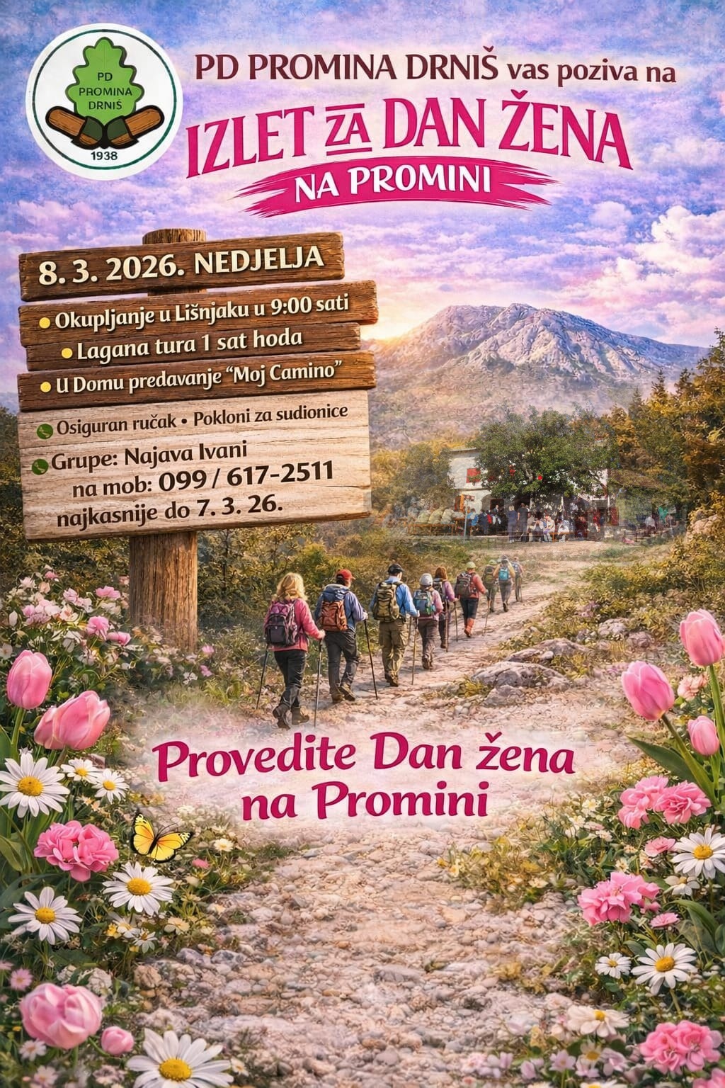 U organizaciji Planinarskog društva Promina, povodom Dana žena organiziraju se izlet na Promini i druženje u planinarskom domu, u nedjelju 8. ožujka 2026.